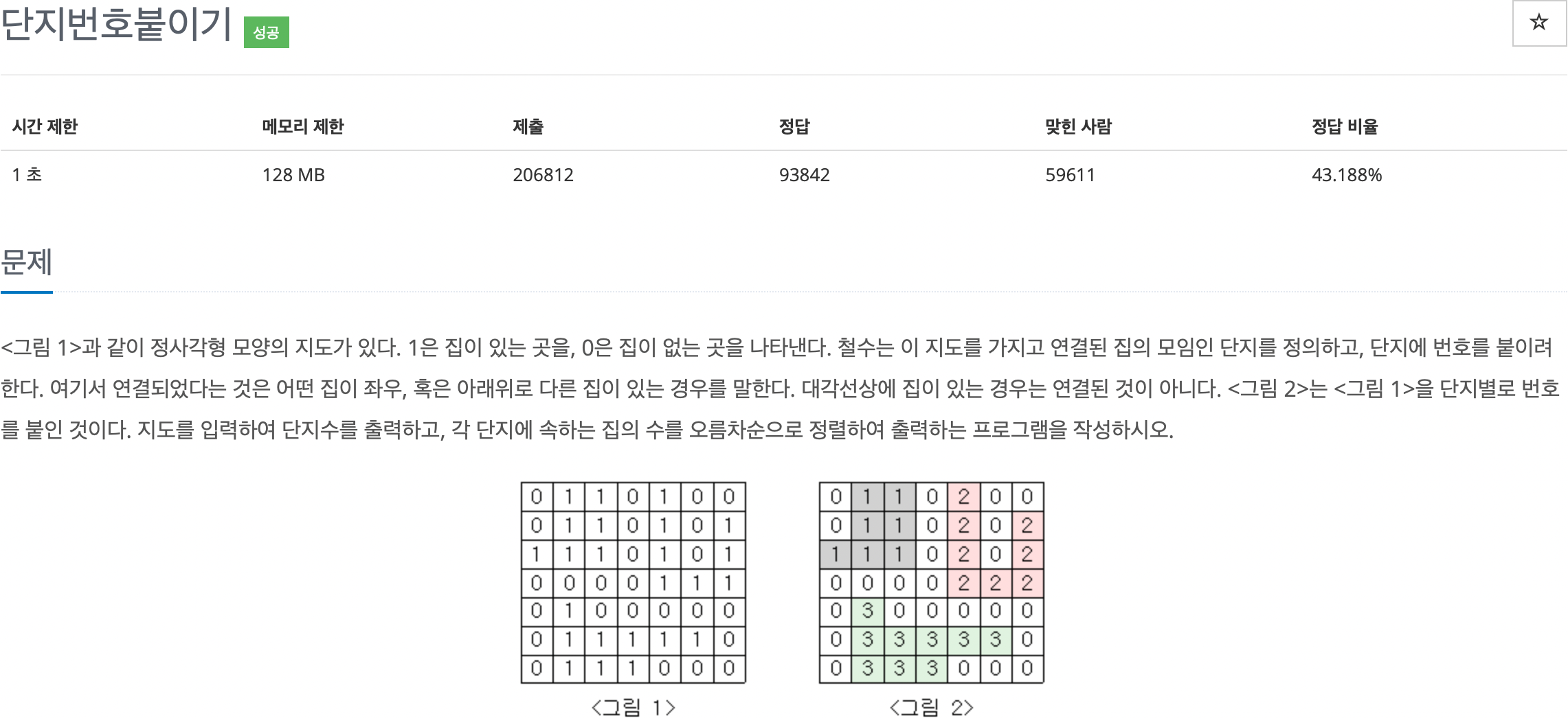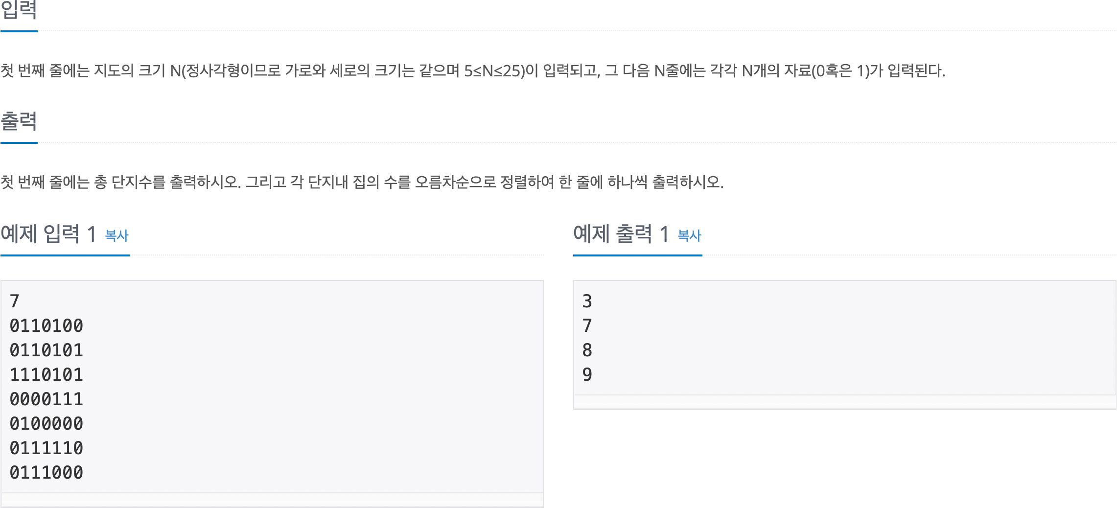 • 각 단지의 크기를 리스트에 저장한 후, 최종적으로 단지 수와 각 단지 크기를 오름차순으로 출력.