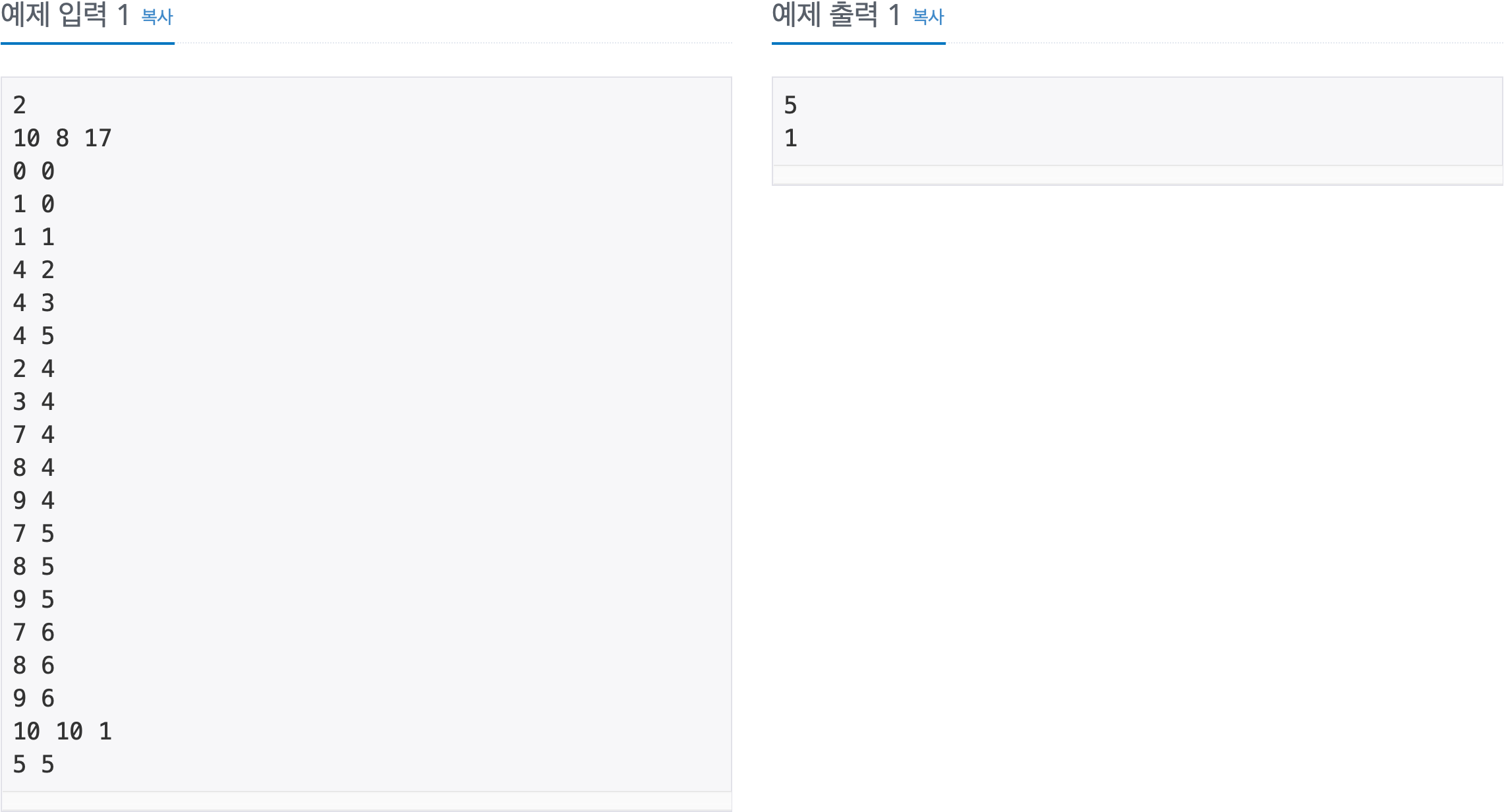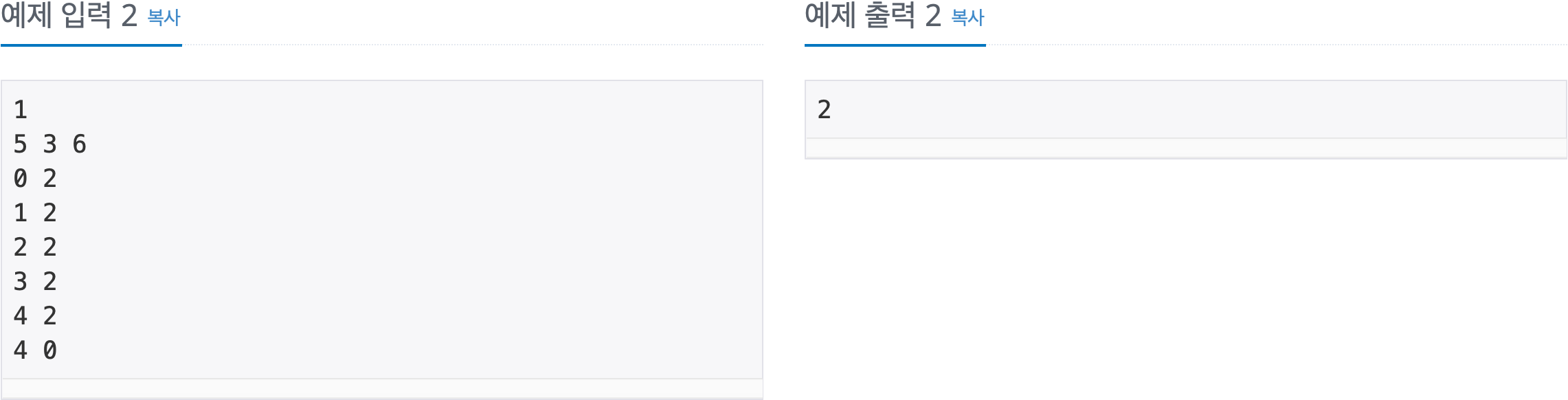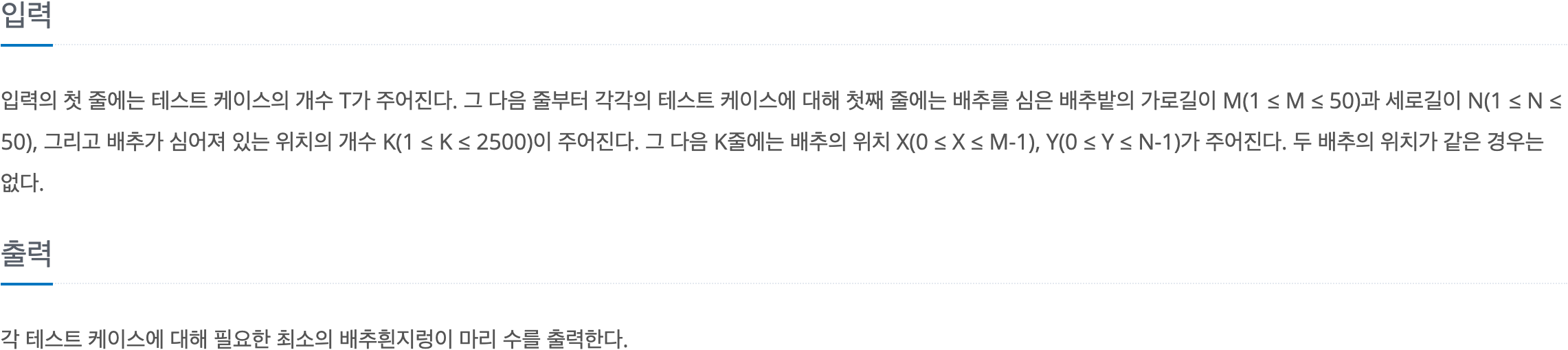 입력으로 T(테스트 케이스 수)를 받아, 각 테스트 케이스마다 배추밭 크기(M x N)와 배추의 위치(K개)를 입력받습니다.