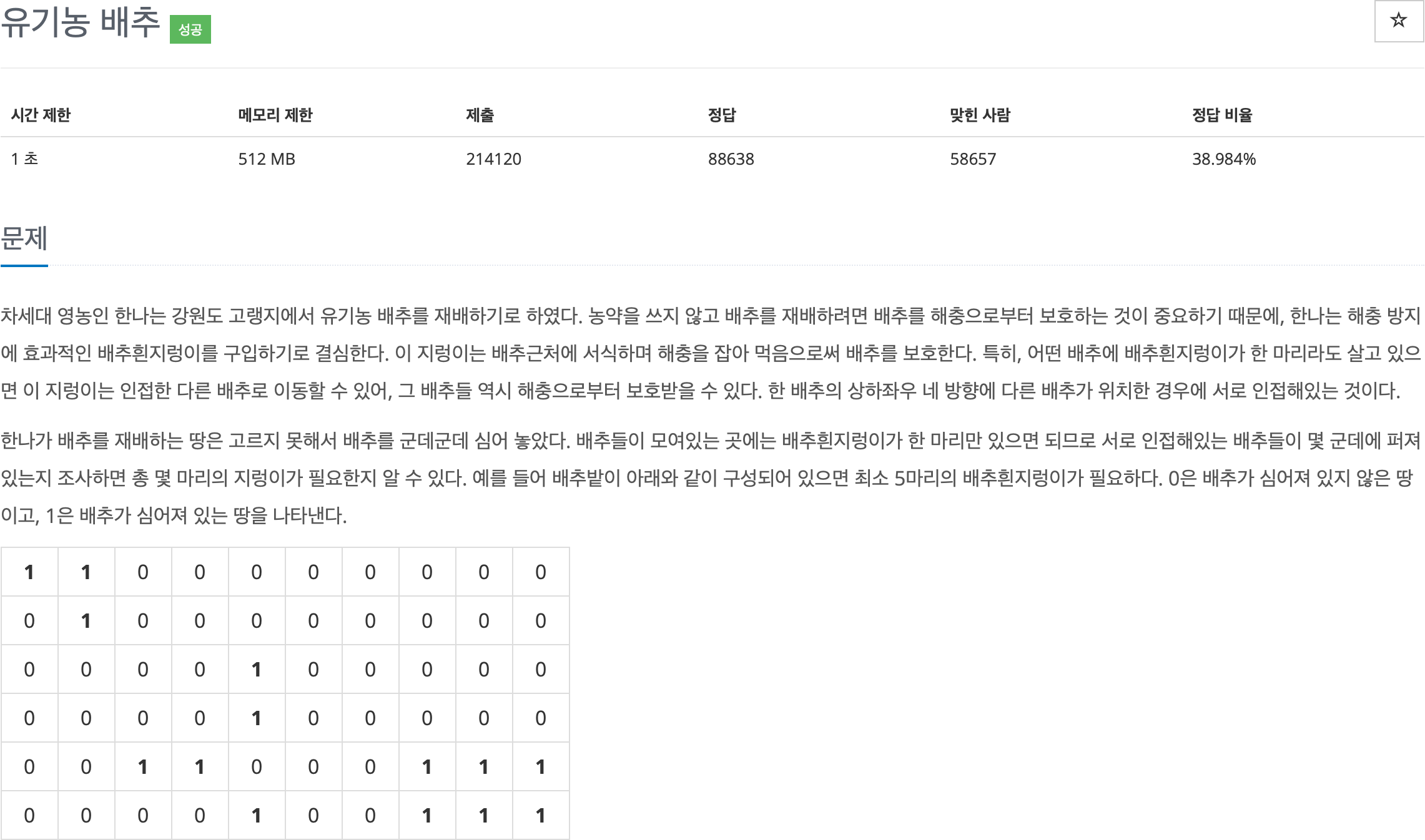 기존 dfs, bfs 문제들과 유사한 문제입니다. 배추는 1칸만 심어져있더라도 지렁이가 있기 때문에, graph[0][0] 부터 시작해서 graph[N][M] 까지 2중 반복문으로 배추가 있고, 방문하지 않은 곳(visit[X][Y] = false)을 발견하면 dfs / bfs로 해당 배추와 연결된 모든 배추를 방문처리합니다. 이후 배추의 군집 개수(result)를 1 증가시킵니다. 누적된 result의 값이 해당 밭의 필요한 지렁이의 개수입니다.