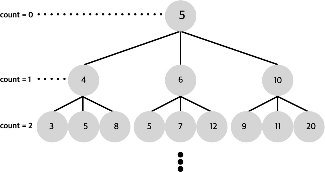 count=2에서는 [3,8,7,12,9,11,20]처럼 말이죠. 이렇게 count를 늘려가면서 처음 K를 찾는다면 해당 count가 K를 찾을 수 있는 최단 시간이라는 것을 알 수 있습니다. 어렵게 설명하기보다는 직관적으로 그래프를 그리는 것이 이해에 도움이 될것이라고 생각했습니다 :)