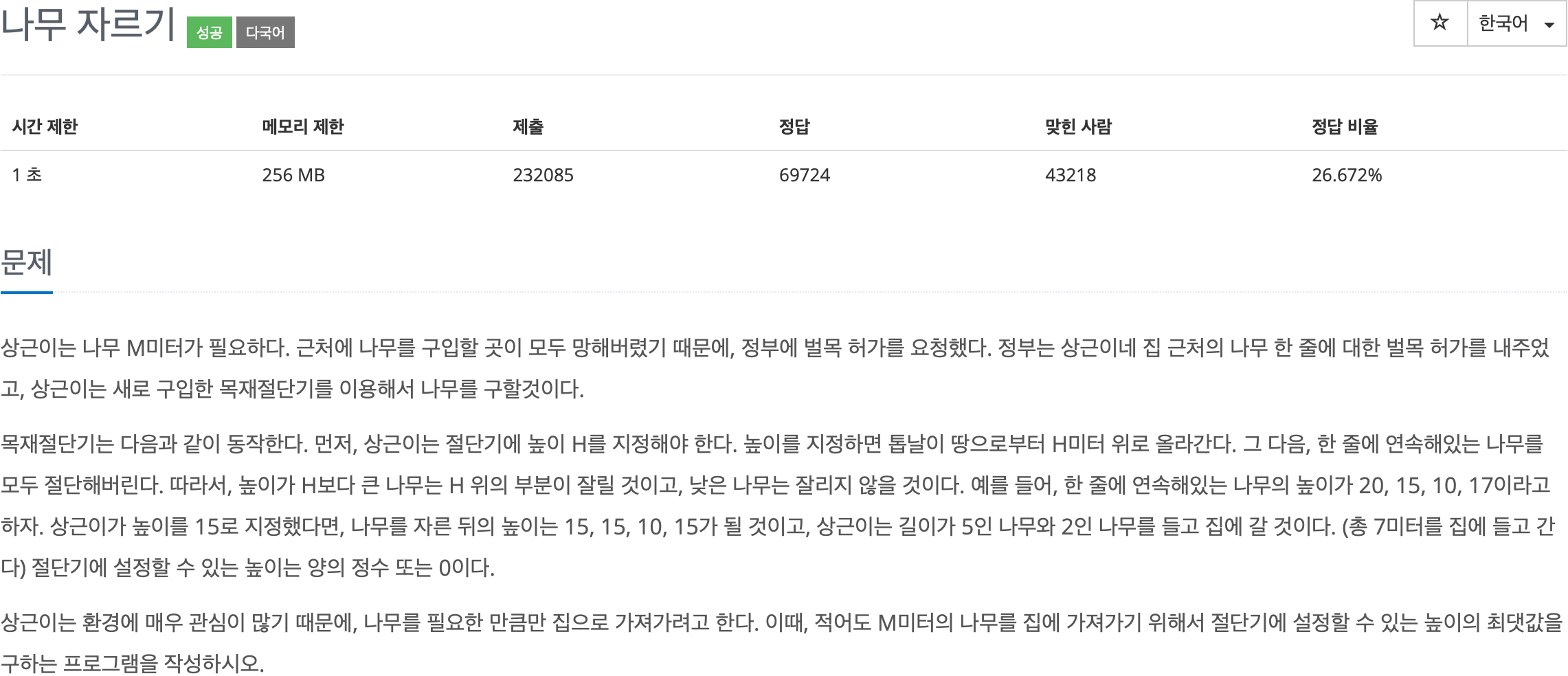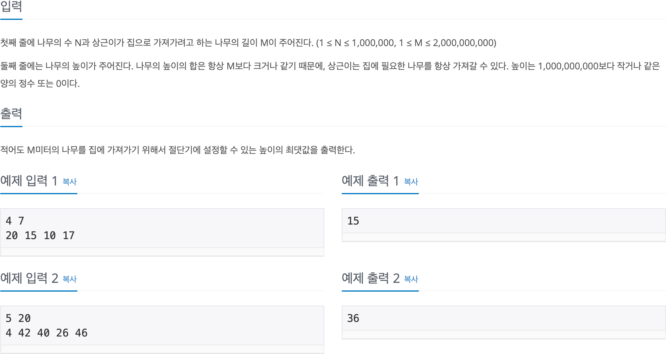 N(나무의 수)와 M(필요한 나무의 길이) 입력받고, N개의 나무 높이를 입력받아 tree[] 배열에 저장합니다. 가장 높은 나무 높이를 max로 설정하고 min <= max일때까지 이분탐색 루프를 실행합니다. 상한값을 찾는 문제이므로 종료된 루프에서 max를 받아 출력합니다.