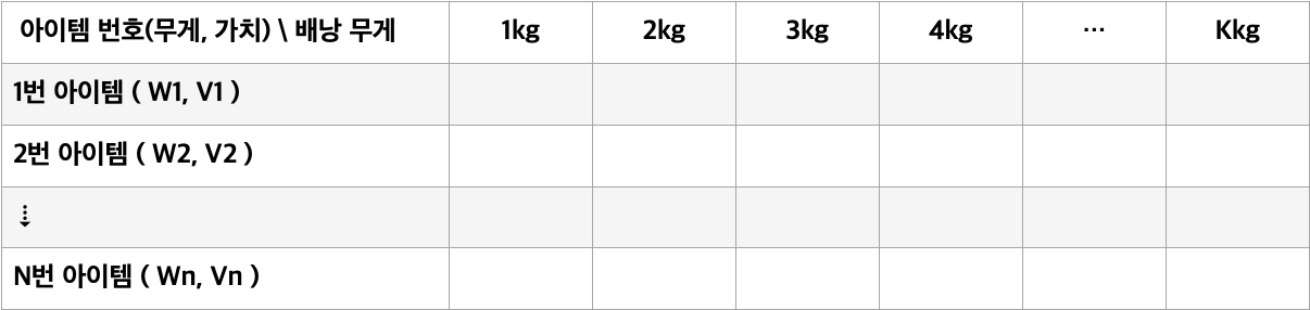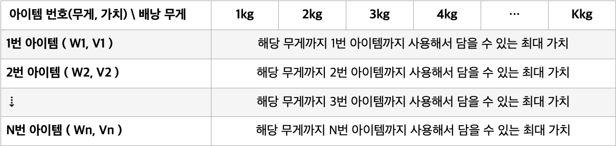 각 셀에는 해당 무게까지 각 아이템을 사용해서 담을 수 있는 최대 가치를 넣습니다.