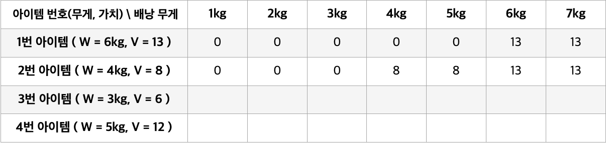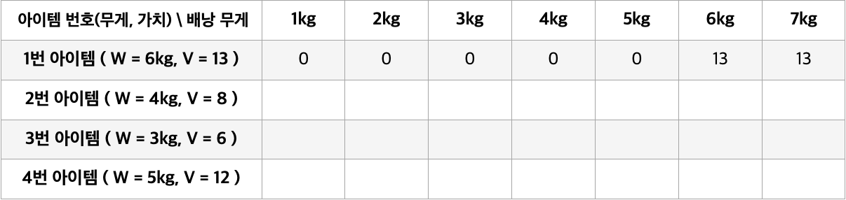 1번 아이템까지 사용하는 경우 1번 아이템의 무게가 6kg이기 때문에 5kg까지는 아무것도 들어갈 수 없고, 6kg이상부터 1번 아이템의 가치인 13의 가치가 들어갈 수 있습니다.