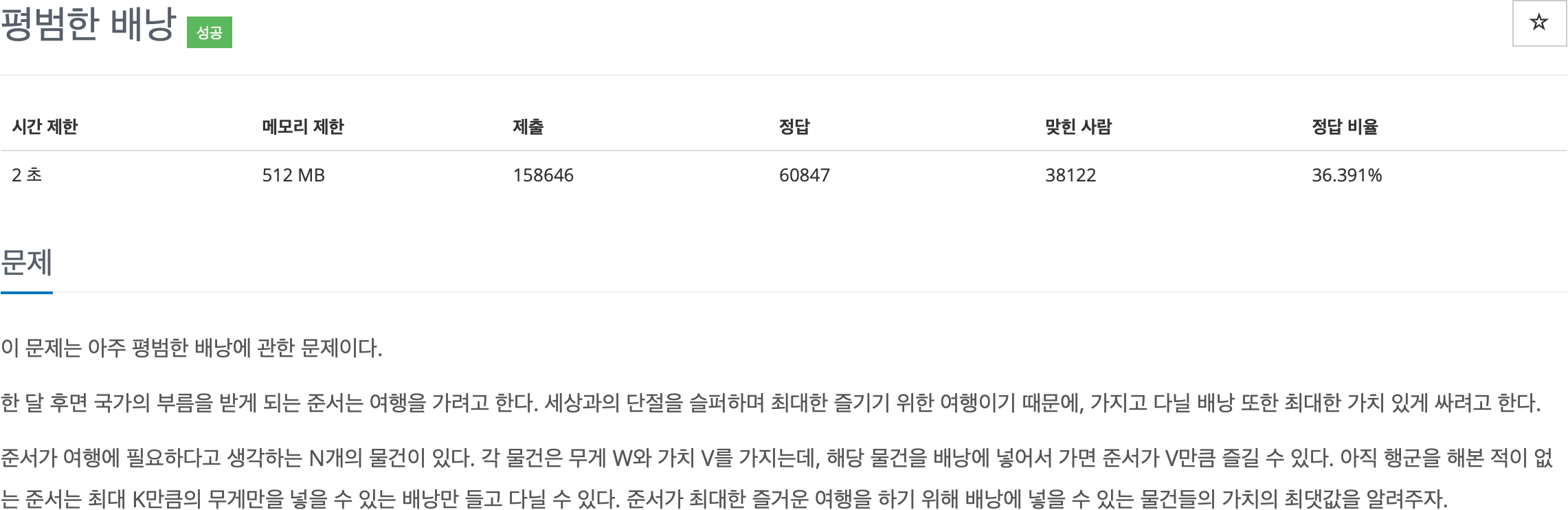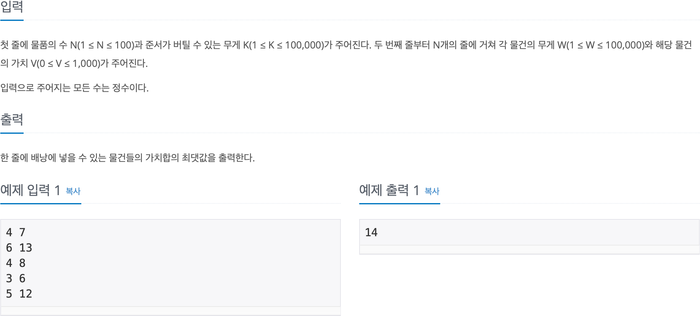 신규 아이템을 i, 배낭에 담을 수 있는 무게를 j라고 했을때, dp[i-1][j]값과 dp[i-1][j-해당아이템의 무게] + 해당 아이템의 가치의 값을 비교하여 메모이제이션을 활용해 푸는 문제입니다. 점화식을 수식으로 알지 못해도, dp배열에 매핑할 값을 구하는 과정을 알게 된다면 응용문제도 어렵지 않게 풀 수 있을것이라고 생각합니다.
