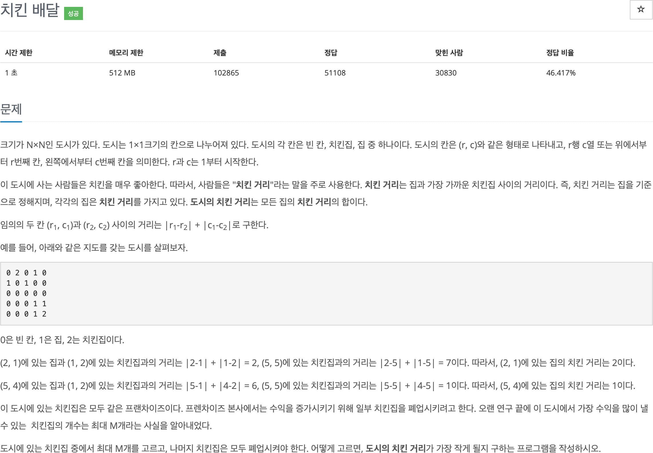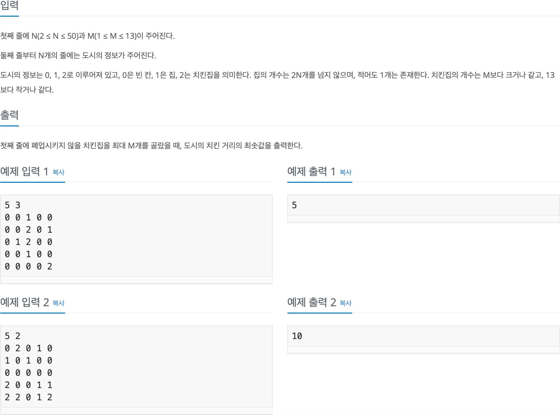브루트포스 문제를 풀면 풀수록 구구단부터 시작된 한국의 교육방식에 절여져 있는 뇌를 빼고 생각해야하는 것 같습니다. 머리속에서는 시각적으로 보여지는 좌표지도를 통해서 폐업하면 안되는 치킨집을 찾아버리기 때문에, 자꾸 그 생각에 지배되는 것 같습니다. 해당 문제를 쉽게 정리하면, 치킨집의 개수에서 조합을 사용하여 M개의 치킨집과 집과의 거리의 최단거리를 누적합하고, 누적합된 거리를 비교하여 가장 값이 작은 거리를 선정하는 알고리즘입니다. 폐업하지 않을 치킨집 M개 선정은 depth를 0으로 두고, depth가 M과 같아진다면 집과 치킨집과의 거리를 계산합니다. 계산하여 저장된 누적합은 백트래킹을 활용해 모든 누적합들을 비교하고, 최소값을 도출하면 어렵지 않게 풀 수 있을것이라고 생각합니다.
