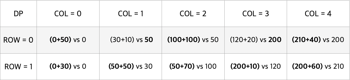 해당 배열의 값을 선택한다면 다른 가로줄의 이전 세로줄에 누적된 최대값(dp[1-row][col-1])과 현재 선택한 원소의 값(arr[row][col])의 값을 더하고, 해당 배열의 값을 선택하지 않는다면, 해당 줄의 이전 세로줄에 누적된 최대값(dp[row][col-1])을 서로 비교하여야 합니다.