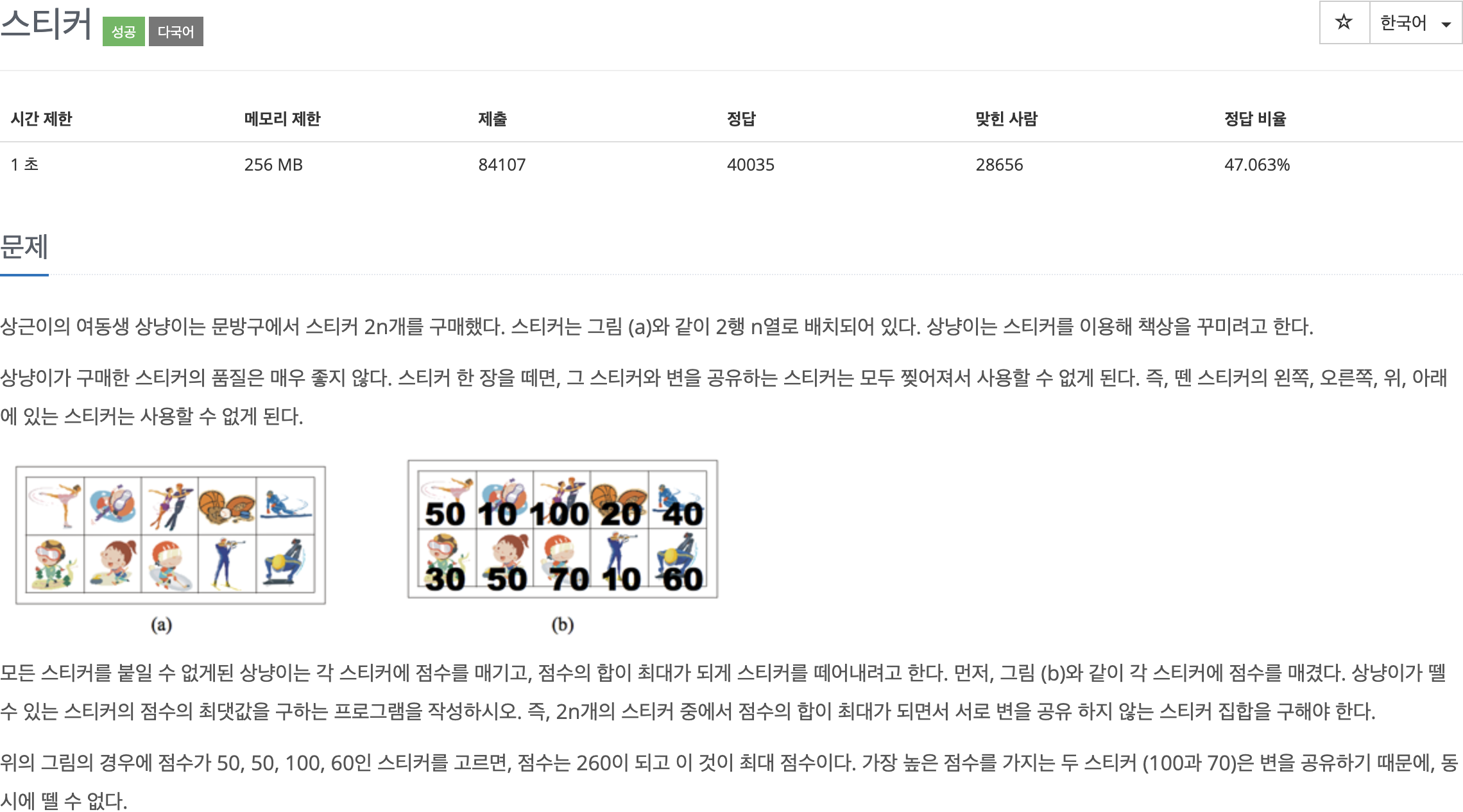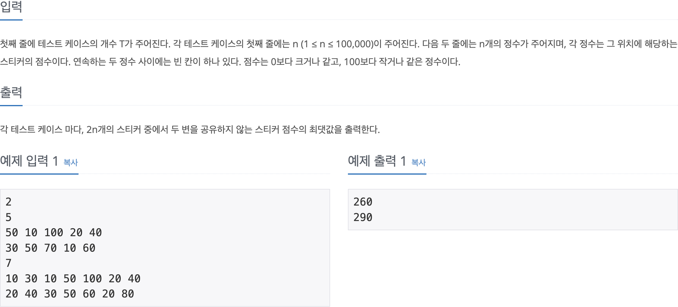 여타 다른 DP문제들과 동일하게 바로 점화식을 구해야 하는 문제입니다. dp배열을 2차원 배열로 선언한 후, 해당 위치의 스티커를 선택할 지 아닐지에 따라 최댓값을 비교해 dp배열을 채워가는 간단한 문제입니다. 점화식은 아래와 같습니다.