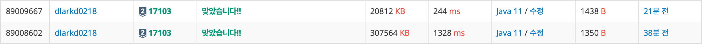 문제에 대한 풀이는 많을 것 같지만, 어떠한 풀이가 가장 효율적인지 생각해보는 것이 핵심인것 같습니다.