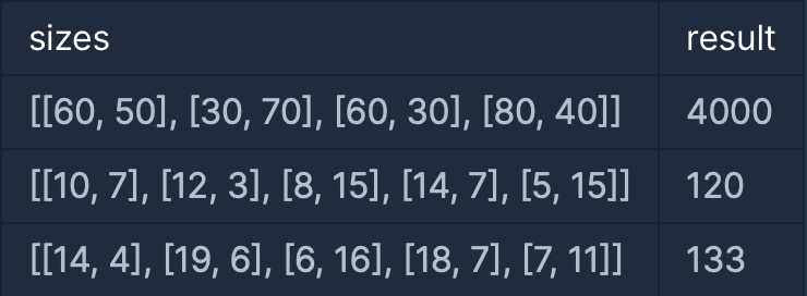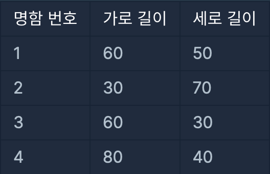 가장 긴 가로 길이와 세로 길이가 각각 80, 70이기 때문에 80(가로) x 70(세로) 크기의 지갑을 만들면 모든 명함들을 수납할 수 있습니다. 하지만 2번 명함을 가로로 눕혀 수납한다면 80(가로) x 50(세로) 크기의 지갑으로 모든 명함들을 수납할 수 있습니다. 이때의 지갑 크기는 4000(=80 x 50)입니다.