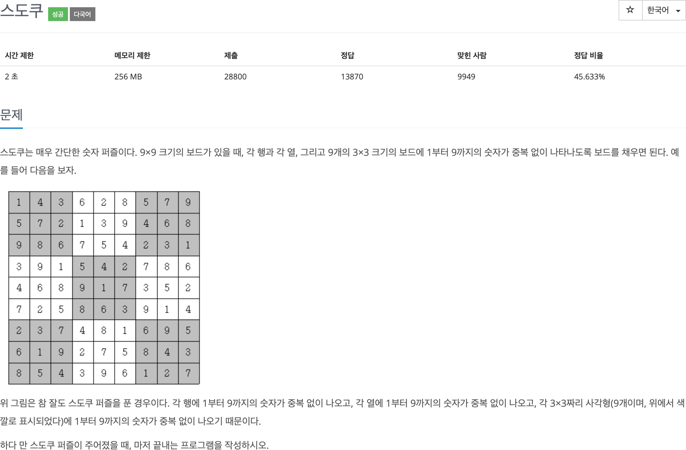 참 어려운 문제였습니다. visit 배열을 3차원 배열로 만들어, visit[0][][]은 열, visit[1][][]은 행, visit[2][][]은 박스로 나누어 행과 열과 3*3박스 배열에 중복되지 않는 수(배열의 인덱스 값이 false인 숫자) 부터 숫자를 채워나가면서 진행이 불가능 할 때, 백트래킹으로 다시 가능한 경우의 수부터 시작하는 알고리즘입니다.