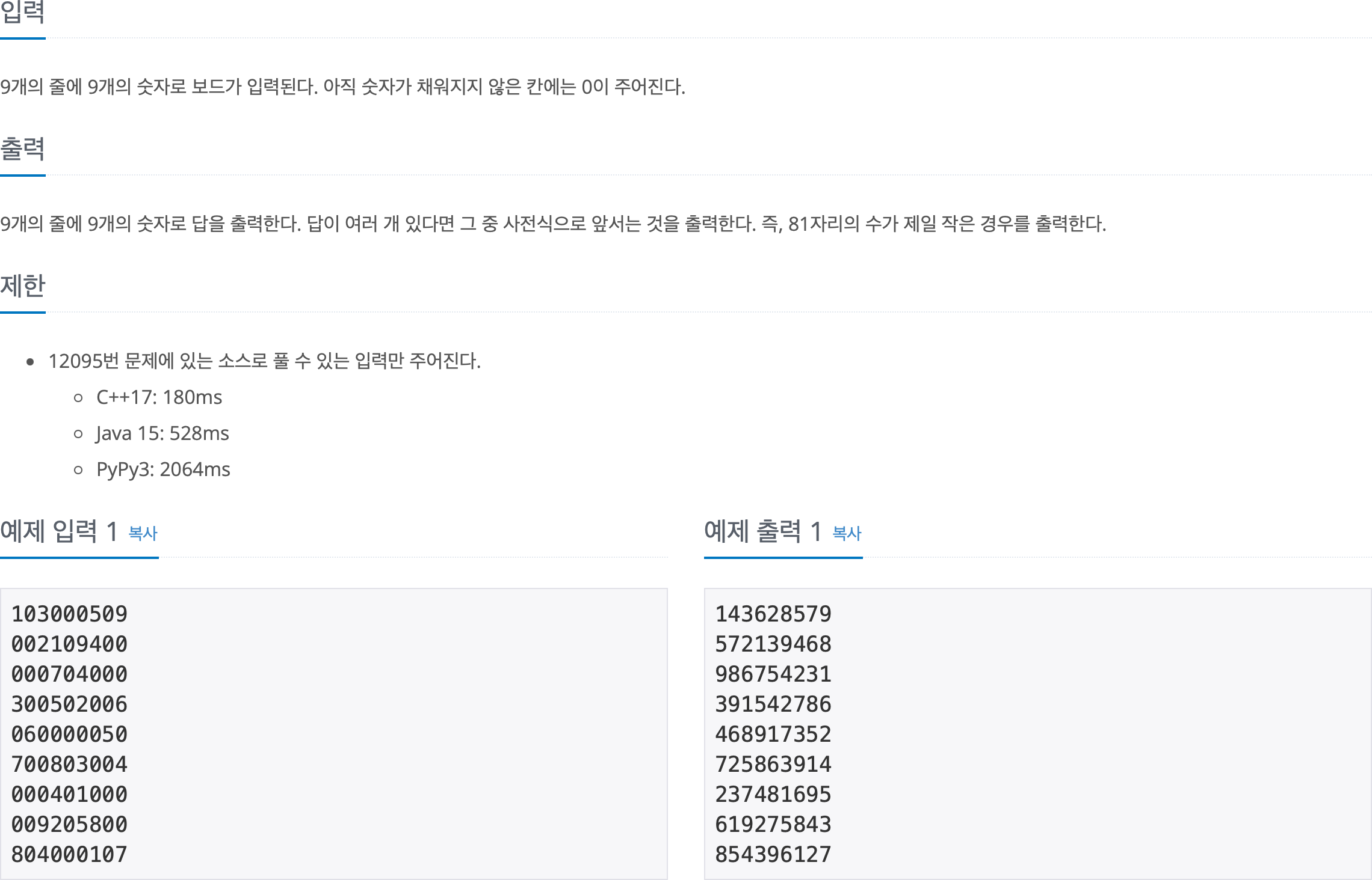 9×9 스도쿠 판을 입력받아 sudoku[][]배열에 저장하고, 동시에 각 숫자가 속한 행, 열, 그리고 3×3 박스에서 사용된 숫자를 기록하는 visit 배열을 입력에 맞게 초기화합니다. 이후 백트래킹을 이용해 findNum 함수를 호출하여 빈 칸을 채워나갑니다.