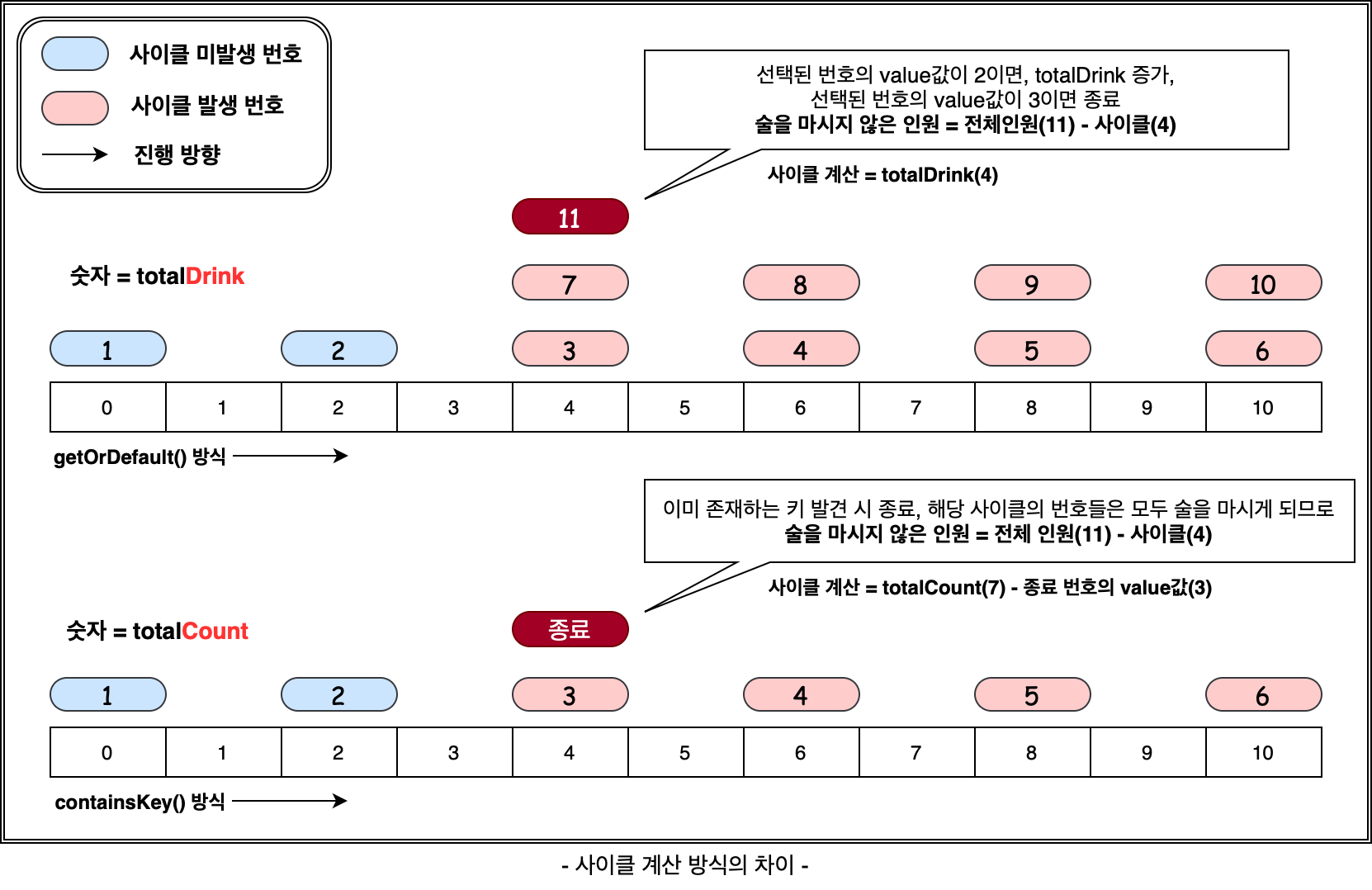 만약 이미 선택된 번호가 HashMap에 존재한다면, 처음 선택된 위치를 이용해 사이클을 계산하고,