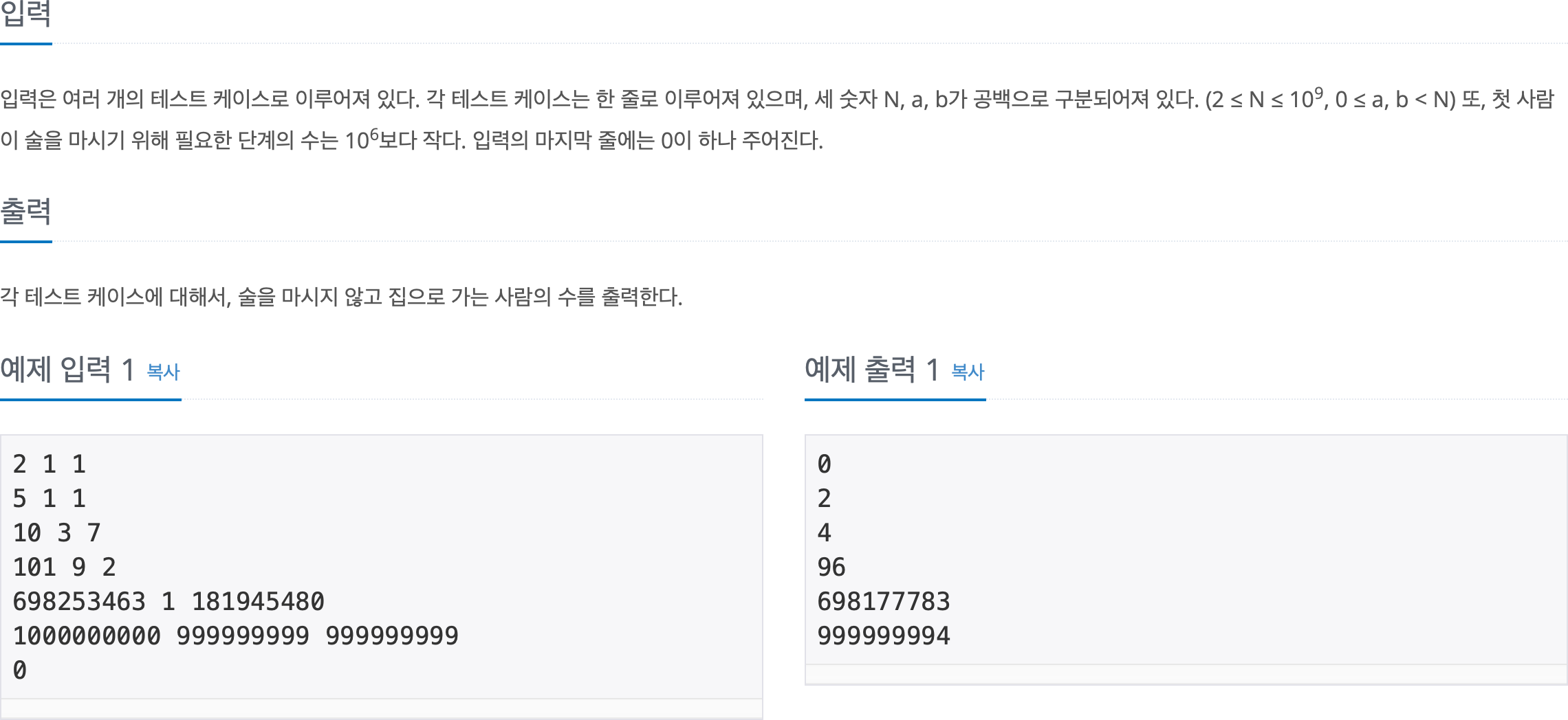 입력으로 N, a, b 값을 받습니다. N == 0이면 프로그램을 종료합니다.