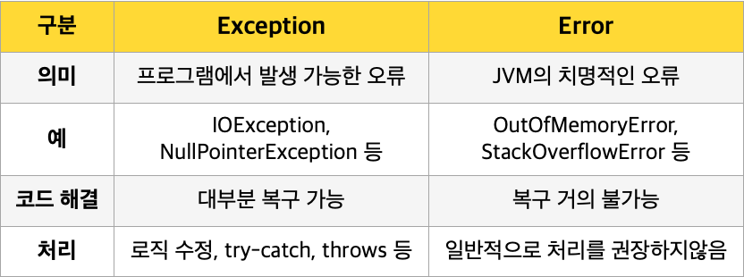 Error는 JVM이나 하드웨어 등 시스템 차원에서 발생하는 심각한 문제로, 애플리케이션 코드 수준에서는 이를 복구할 수 없습니다.