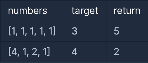 사용할 수 있는 숫자가 담긴 배열 numbers, 타겟 넘버 target이 매개변수로 주어질 때 숫자를 적절히 더하고 빼서 타겟 넘버를 만드는 방법의 수를 return 하도록 solution 함수를 작성해주세요.