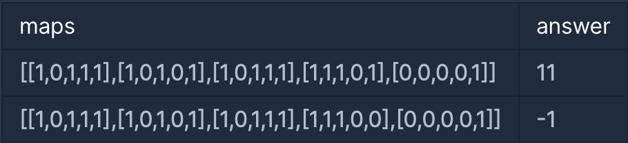 게임 맵의 상태 maps가 매개변수로 주어질 때, 캐릭터가 상대 팀 진영에 도착하기 위해서 지나가야 하는 칸의 개수의 최솟값을 return 하도록 solution 함수를 완성해주세요. 단, 상대 팀 진영에 도착할 수 없을 때는 -1을 return 해주세요.