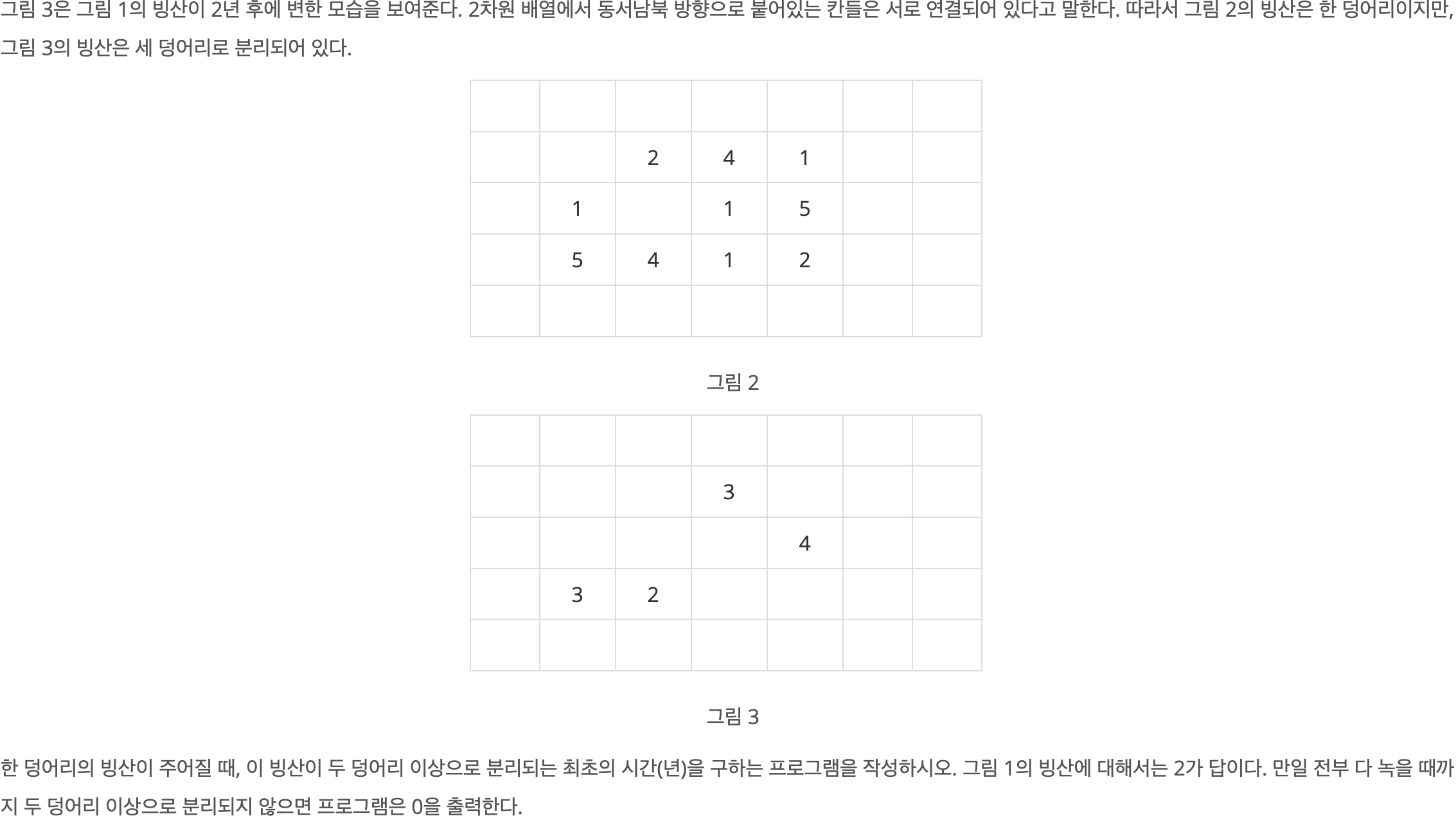빙산의 개수가 처음으로 2개 이상이 되는 햇수를 찾는 방식입니다.