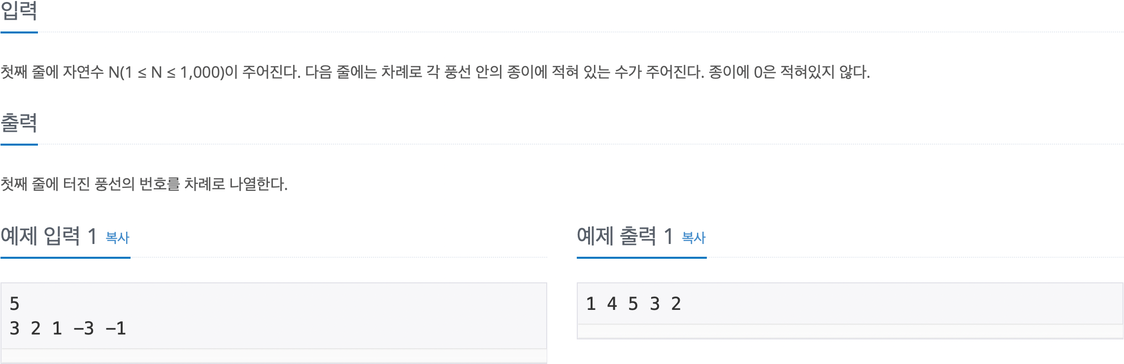 풍선에 적힌 숫자를 입력받아 배열과 덱에 저장합니다. 덱의 인덱스는 1-base-position으로 저장합니다.