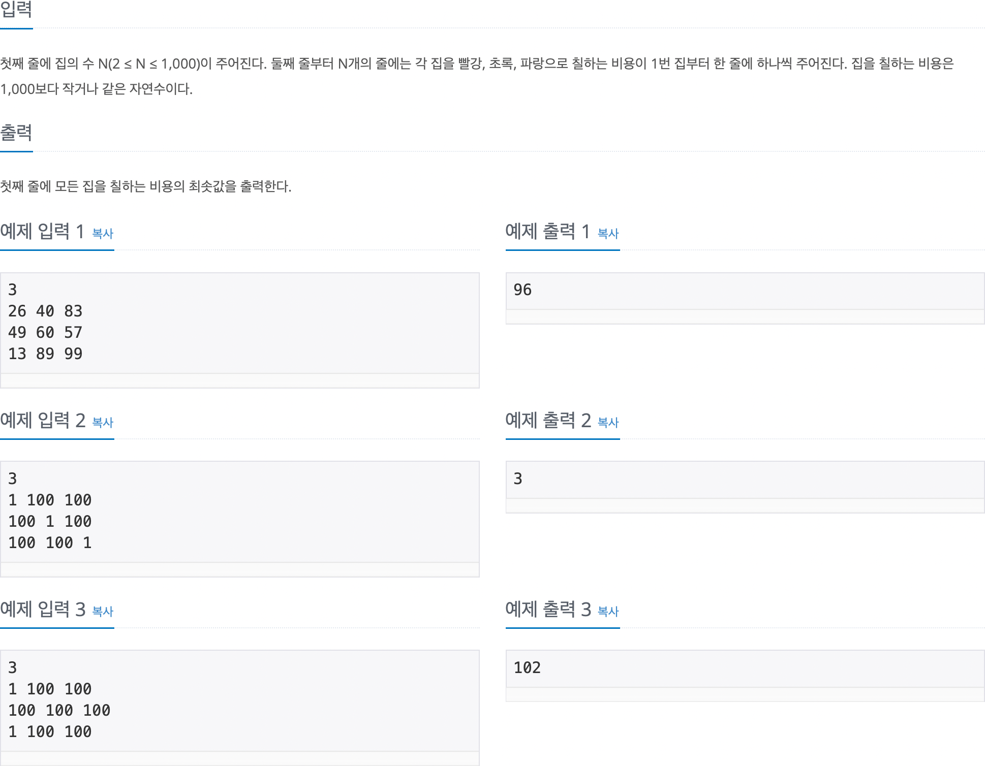 두번째 집부터는 전에 칠한 색과 겹치지 않는 두 개의 색 중에서 최소의 비용이 드는 값을 누적하여 더해가야 합니다.