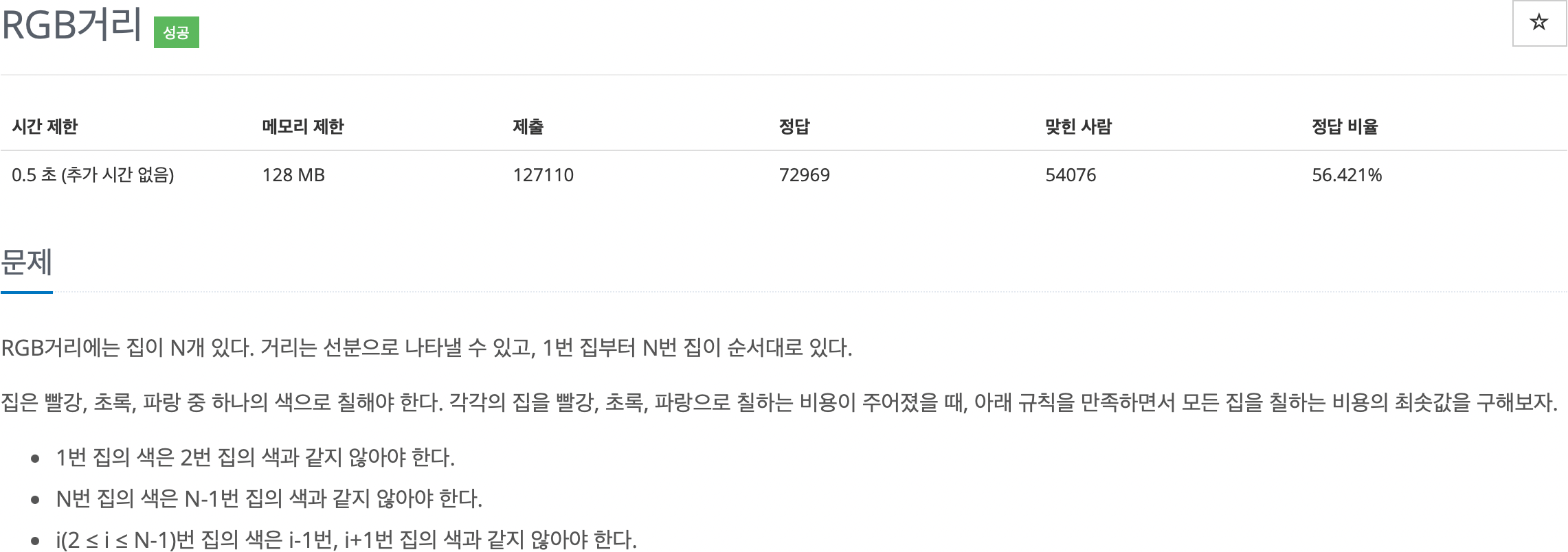 최소의 비용이 드는 집의 색을 구하기 위해서는, 메모이제이션이 필수입니다. 첫번째 집의 RGB를 제외하고,