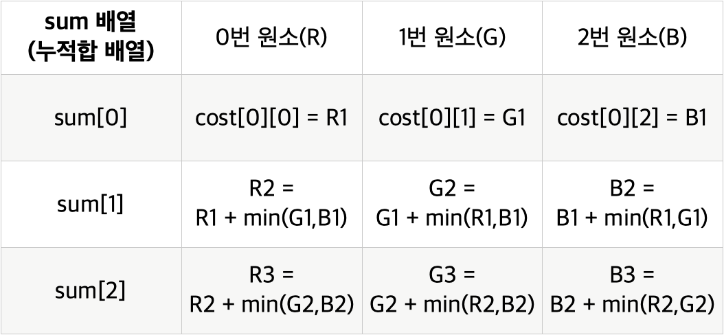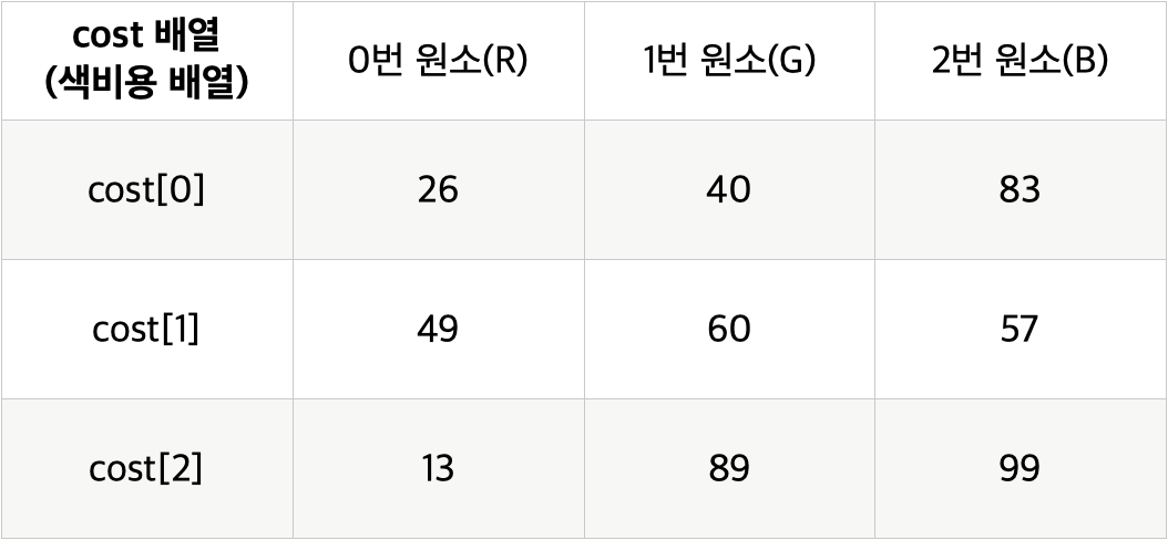 이후, 가장 마지막으로 더해진 배열의 R3, G3, B3 중 최솟값이, 가장 최소의 비용이란것을 알 수 있습니다.