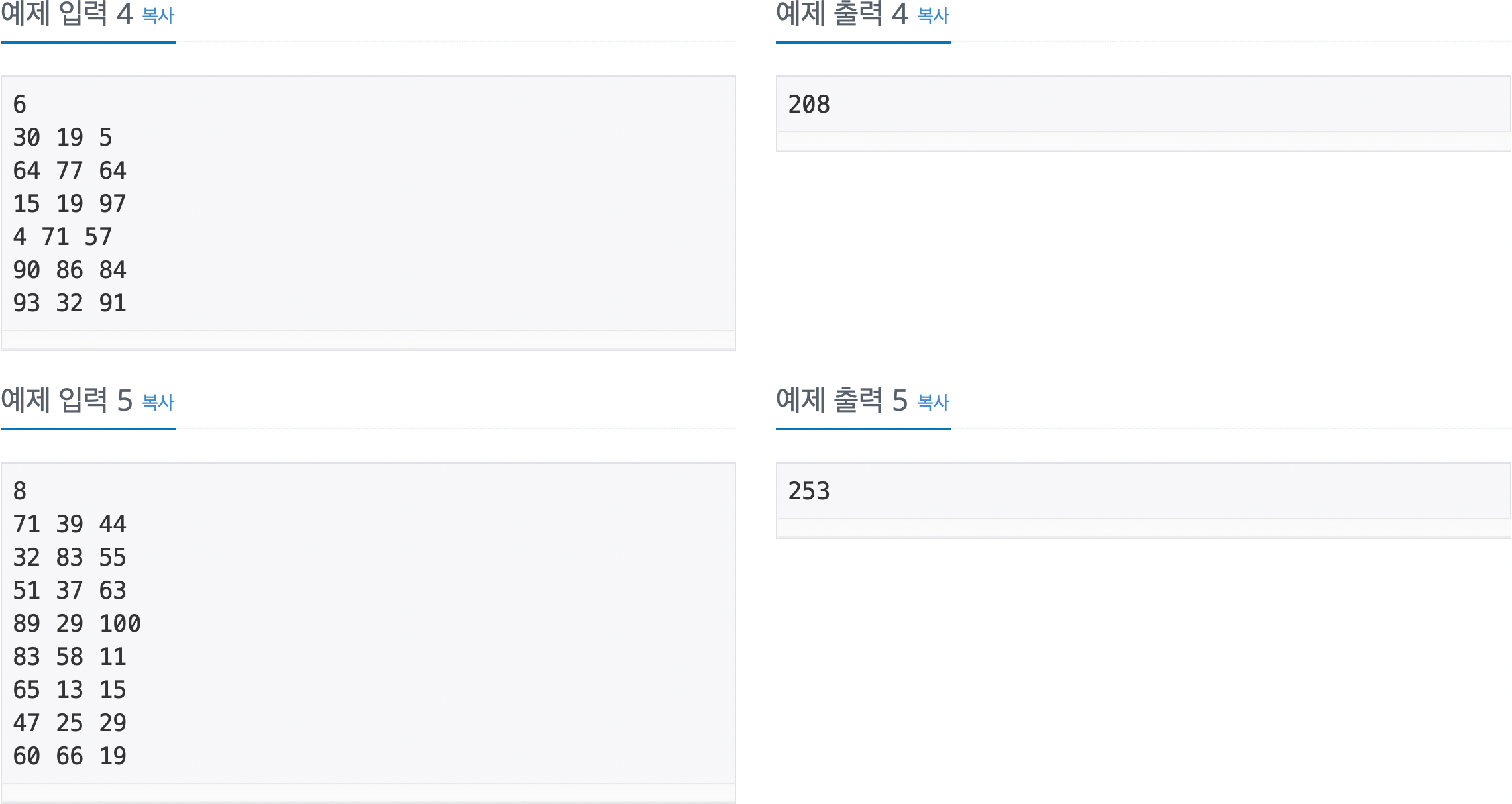 누적이 모두 끝나면 sum의 마지막 배열의 3개 원소에서 최솟값을 구해 반환합니다.